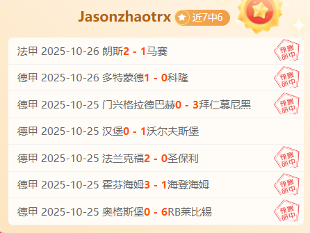【战绩回顾】状态红红燚燚近7胜6,命中法甲比分朗斯2-1马赛,命中德甲比分多特1-0科隆---法兰克福2-0圣保利---霍芬海姆3-1海登海姆,命中比分德乙沙尔克1:0达姆斯塔特,命中比分美职业迈阿密国际3-1纳什维尔,命中比分中美俱杯阿拉胡埃伦斯1 : 1CD奥林匹亚,命中比分欧罗巴杯赛费耶诺德3-1帕纳辛纳--里昂2-0巴塞尔--弗赖堡2-0乌德勒支,命中比分欧冠比利亚雷亚尔0-2曼城,命中比分南美杯山谷独立1-1米内罗竞技,命中瑞超比分哥德堡0-2米亚尔比,命中意甲比分克雷莫纳1-1乌迪内斯,命中德甲比分弗莱堡2-2法兰克福,海登海姆2-2云达不来梅,拜仁2-1多特蒙德,命中德乙比分纽伦堡1-1荷印尔斯泰因,瑞超近5胜率80%,德甲近20胜率75%,