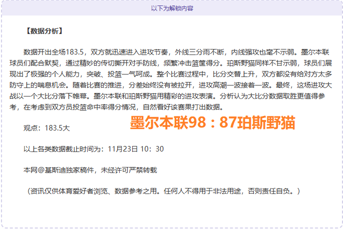 【成绩回顾】昨获胜,NBL获得胜率,精选比赛拆解本期再创连胜新高度,篮球方向连胜呈现非同凡响,拆解精准比赛继续收获连胜,篮球板块拆解数据勇往直前,资深篮球爱好者,用独立方式拆解赛事再为大家奉上。以下再为大家分享一场精彩赛事,敬请期待!