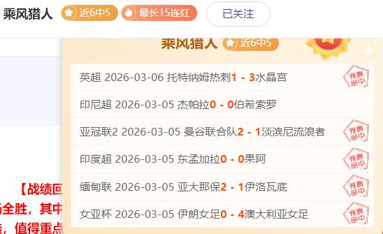 【战绩回顾】火热又是6胜5,中超18胜14,中超新赛季来了,这周很炸裂!早场女亚杯+亚冠+印度+缅甸4场大捷,晚间重点场水晶宫拿下,乘风重点场7天全胜,欢迎关注!每日仅1场(欢迎主页解锁,量少求精选,值得重点关注)!全力分析,只王牌精研有把握的比赛,信心继续拿下,加油冲全胜!欢迎长期关注乘风。